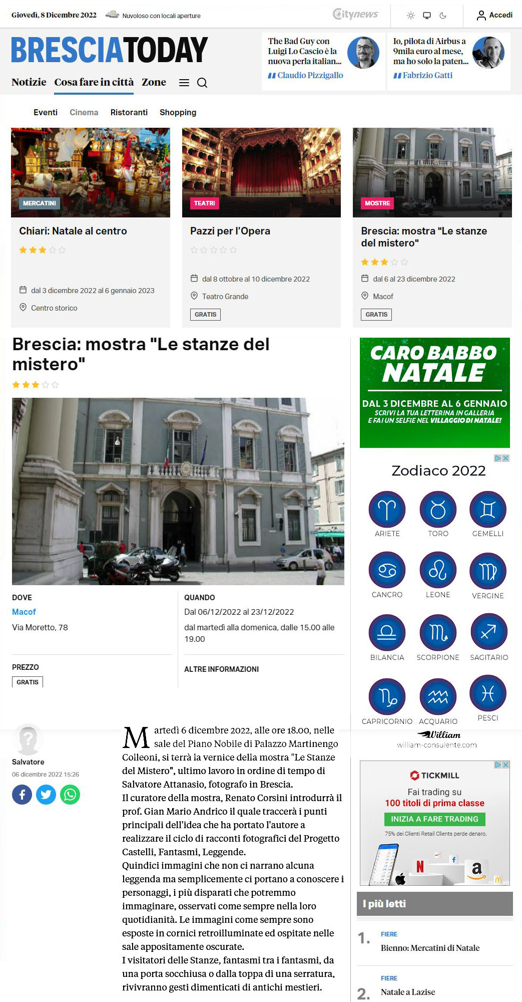 GIORNALE di BRESCIA, martedì 6 dicembre 2022, pag. 16 Al "MACOF" i castelli di Salvatore Attanasio Inaugura oggi alle 18 al Macof (Centro della fotografia italiana) di via Moretto 78, in città, la mostra «Castelli, fantasmi, leggende - Le stanze del mistero» con le fotografie di Salvatore Attanasio. Attanasio - 77 anni, da sempre attivo sul fronte della fotografia e della grafica - è da anni impegnato in un progetto che lo porta a raccontare per immagini l’intimità dei castelli del nostro territorio... continua |